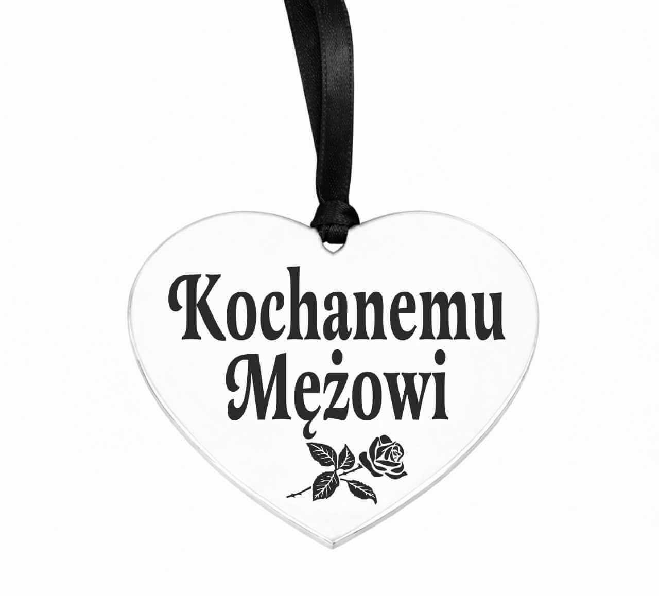Zawieszka na znicz - serce, bezbarwna z czarnym grawerem, dla Kochanego Męża, personalizowana dekoracja nagrobna