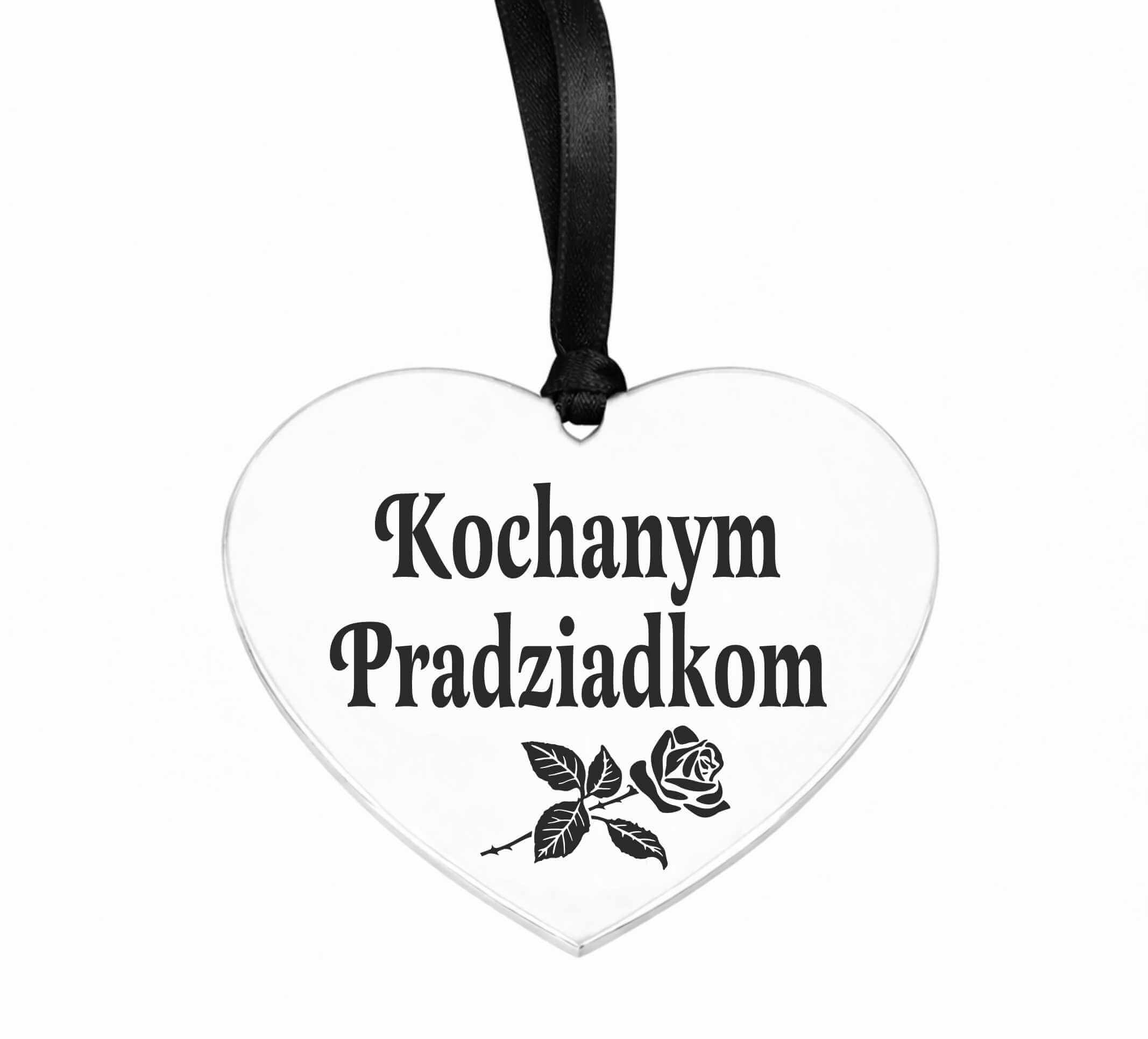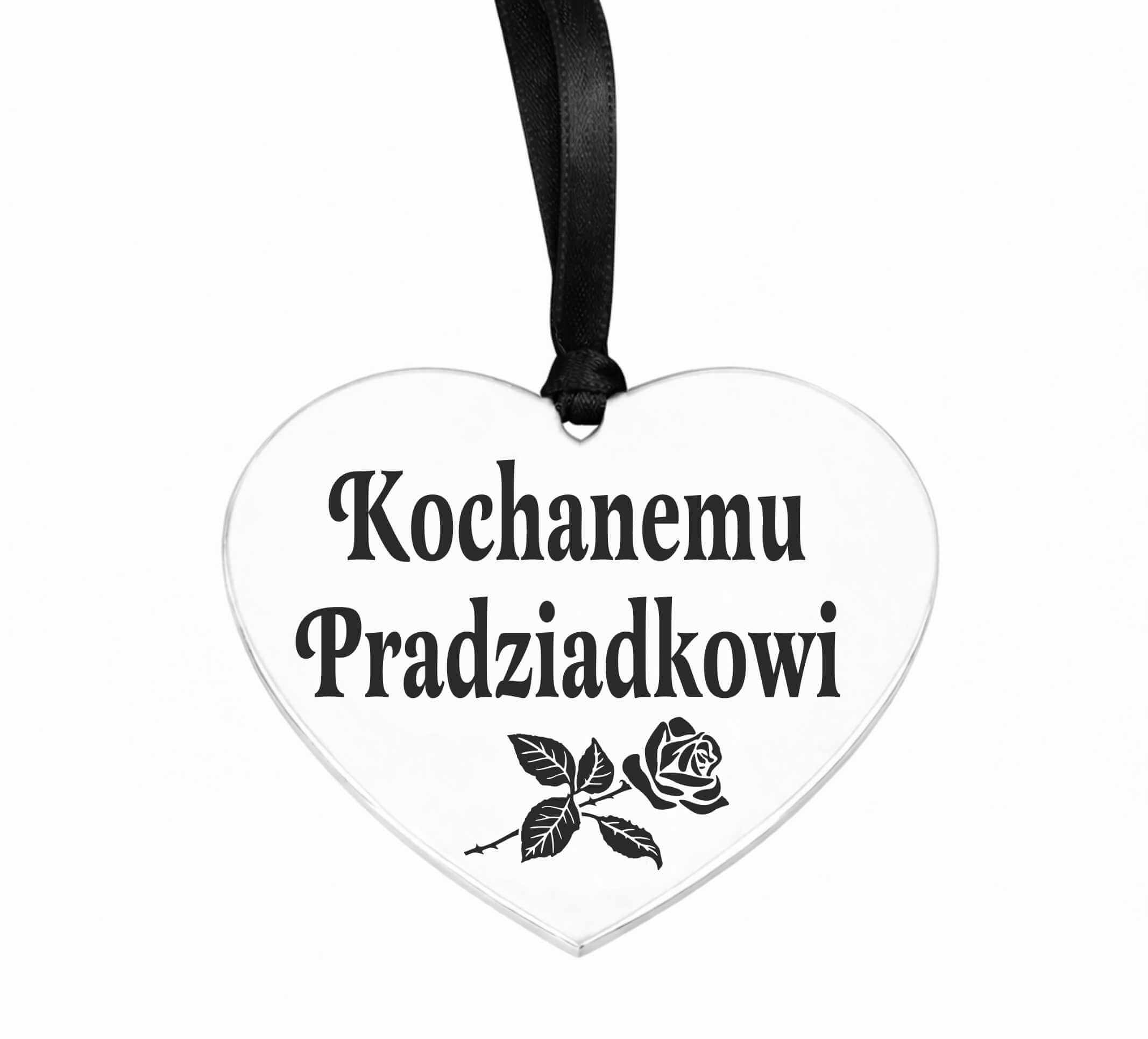 Zawieszka na znicz - serce, bezbarwna z czarnym grawerem, dla Kochanego Pradziadka, personalizowana dekoracja nagrobna