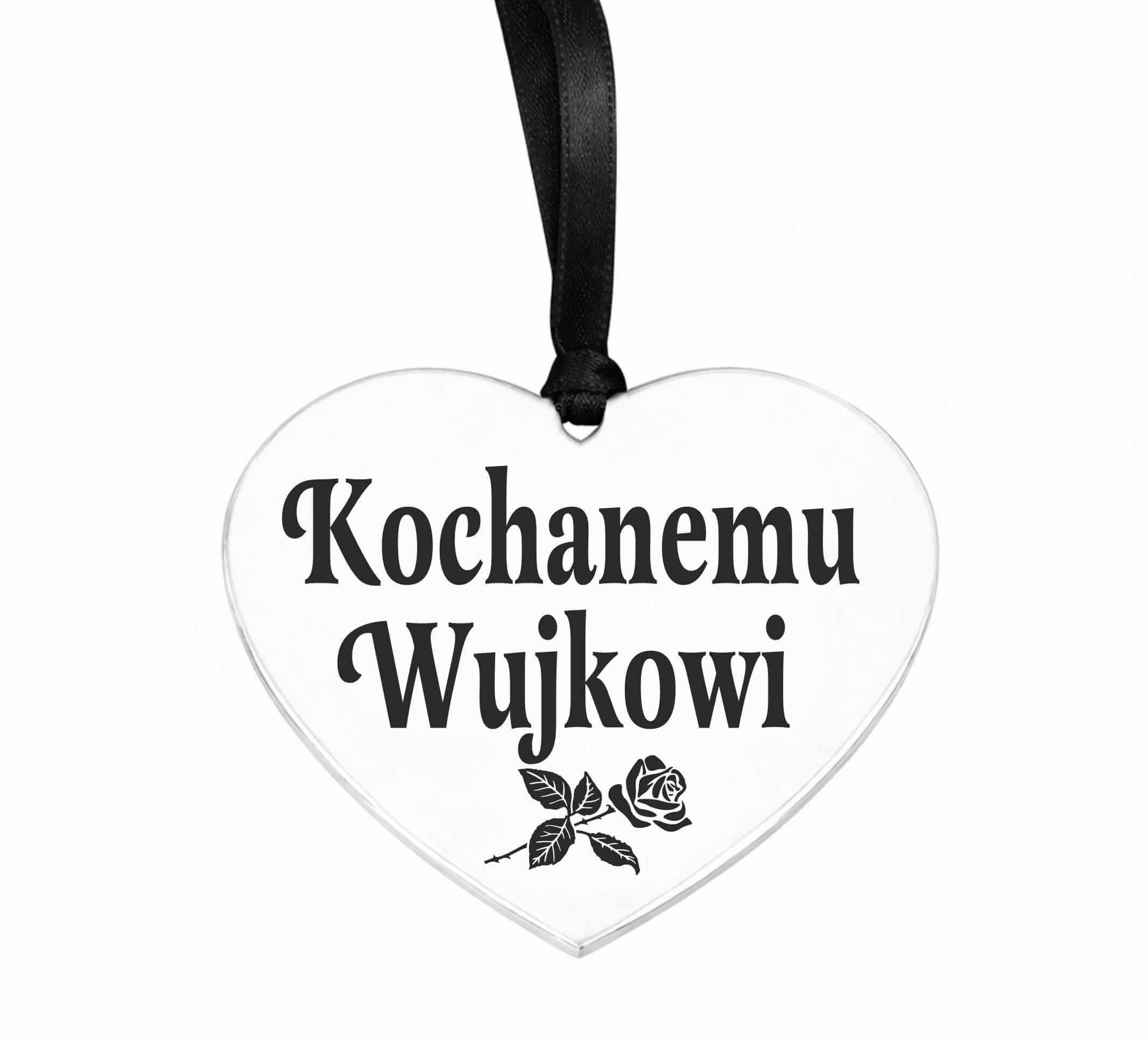 Zawieszka na znicz - serce, bezbarwna z czarnym grawerem, dla Kochanego Wujka, personalizowana dekoracja nagrobna