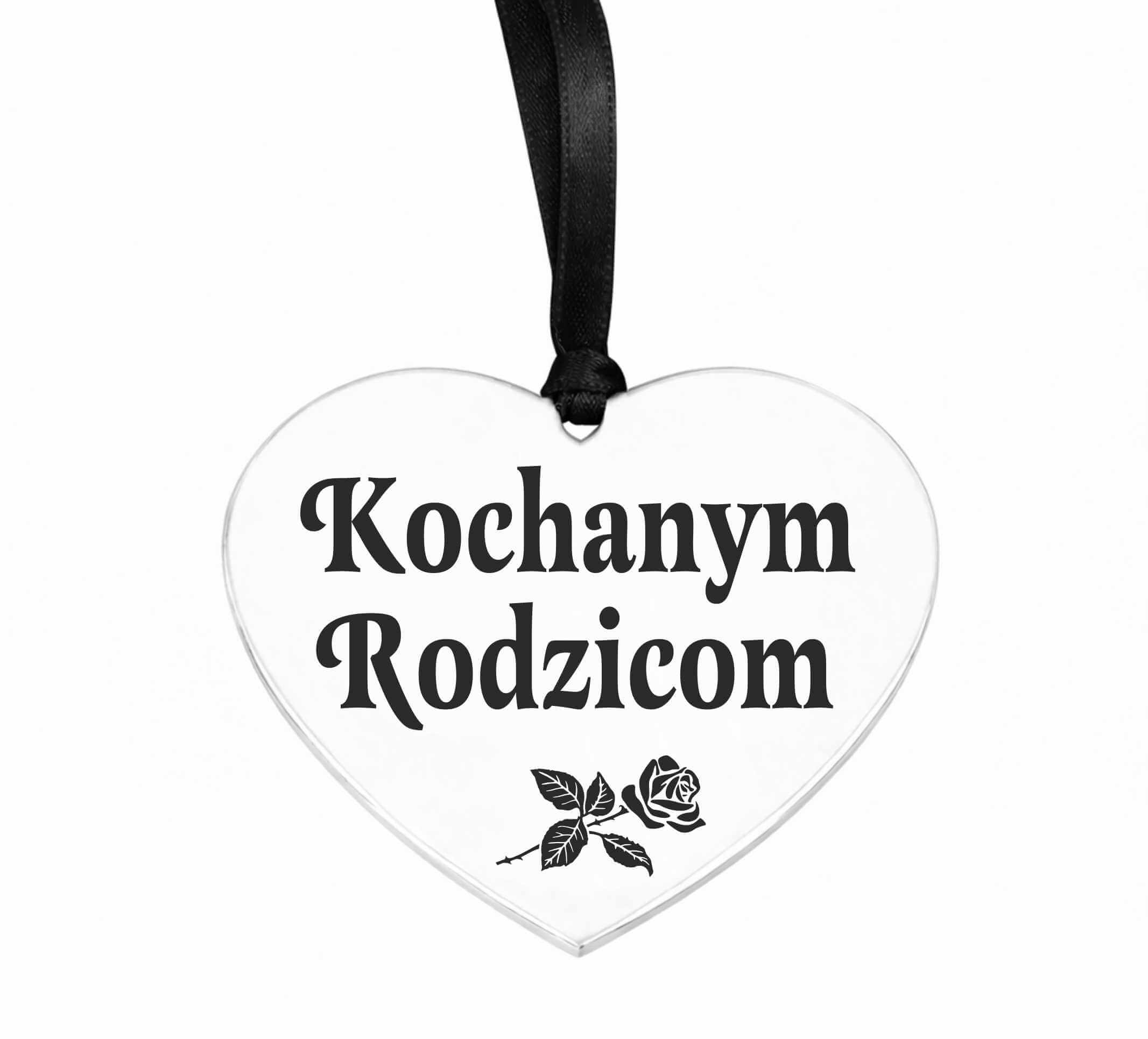 Zawieszka na znicz - serce, bezbarwna z czarnym grawerem, dla Kochanych Rodziców, personalizowana dekoracja nagrobna