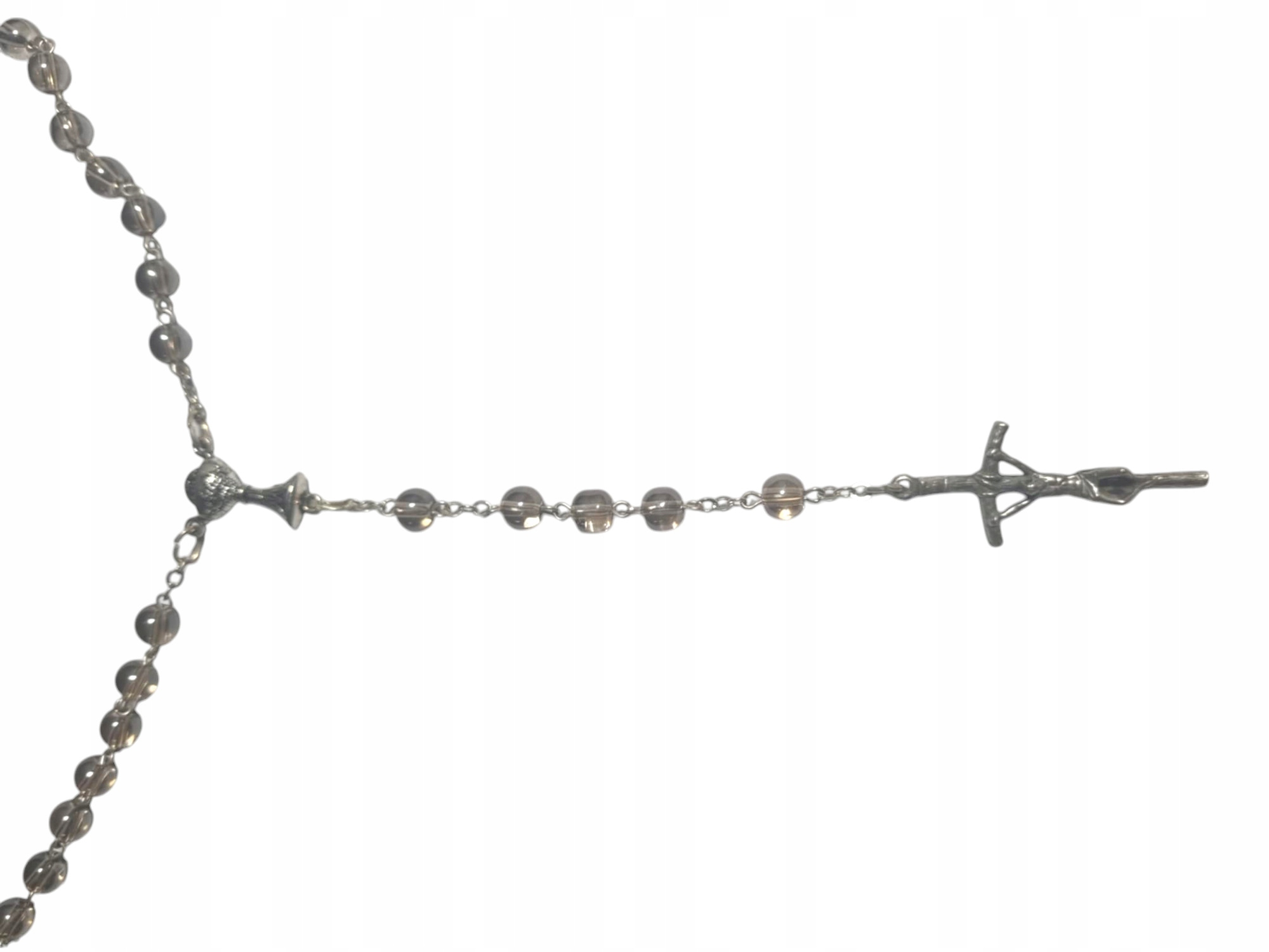 RÓŻANIEC wykonany jest z koralików. Krzyżyk papieski, kielich z IHS oraz łączniki wykonane są z metalu.