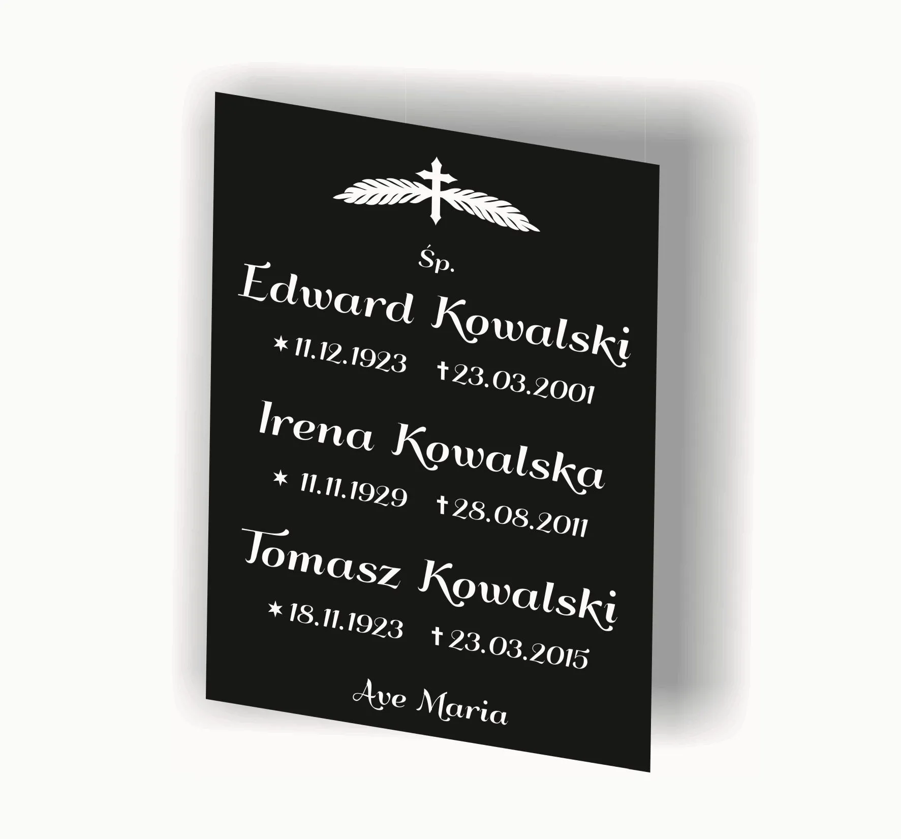 Tablica nagrobna wykonana jest z czarnego szkła akrylowego (pleksiglas), które jest bardzo wytrzymałe i odporne na warunki atmosferyczne i nie podlegające procesowi korozji. Tabliczka na cmentarz jest bardzo czytelna, a wygrawerowane napisy dobrze widoczne.