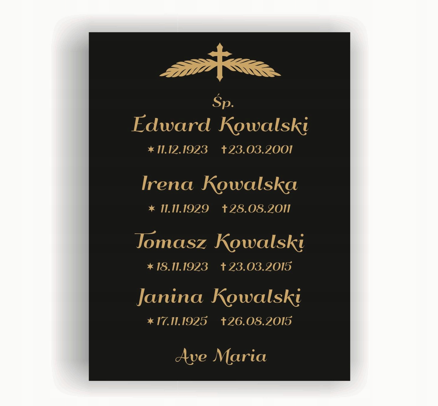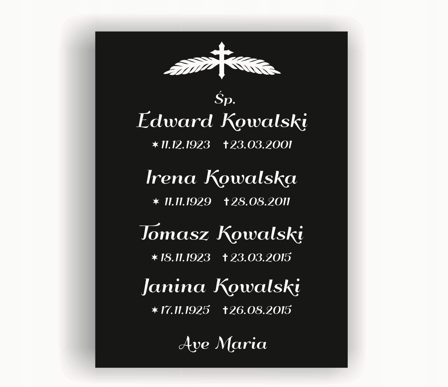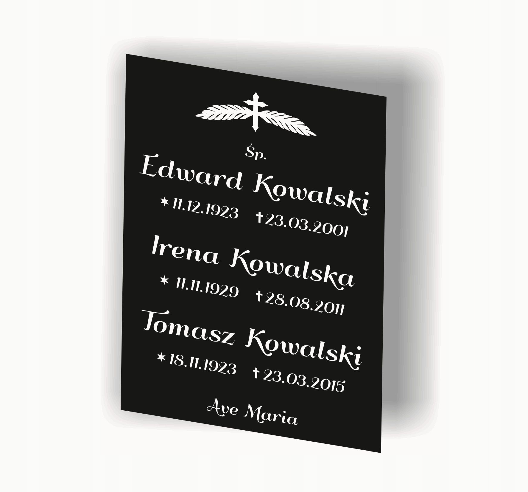 Wykonana jest z czarnego szkła akrylowego (pleksiglas), które jest bardzo wytrzymałe i odporne na warunki atmosferyczne i nie podlegające procesowi korozji. Tabliczka nagrobkowa jest bardzo czytelna, a wygrawerowane napisy dobrze widoczne.