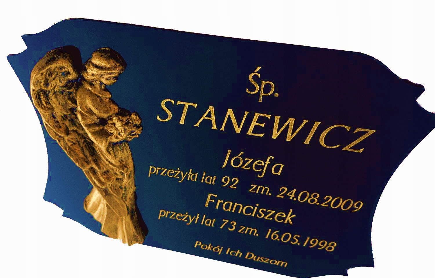 Na tabliczce znajduje się postać Anioła wykonany z tworzywa PCV, pokryty farbą odporną na warunki atmosferyczne – dostępny w kolorze złotym lub srebrnym. To piękny, symboliczny akcent.