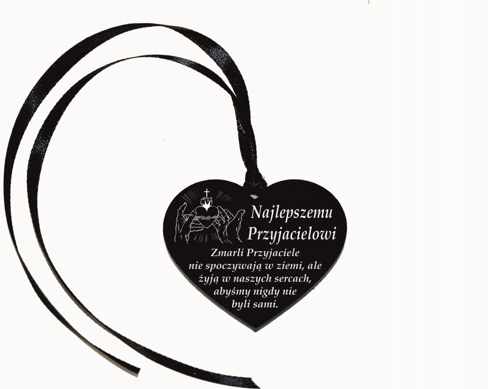 Dedykacja i grafika jest grawerowana a następnie malowana na kolor biały. Każda zawieszka ma wstążeczkę (kolor losowy), która umożliwia powieszenie np. na zniczu
