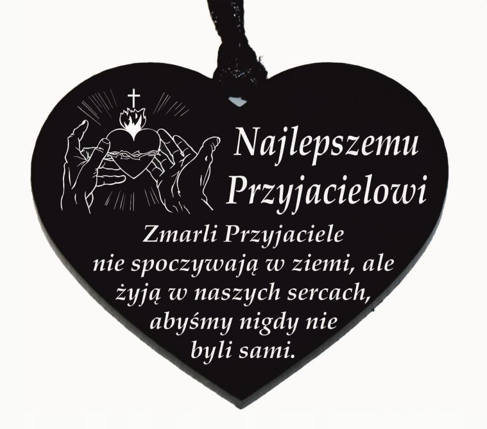 Dedykacja i grafika jest grawerowana a następnie malowana na kolor biały. Każda zawieszka ma wstążeczkę (kolor losowy), która umożliwia powieszenie np. na zniczu
